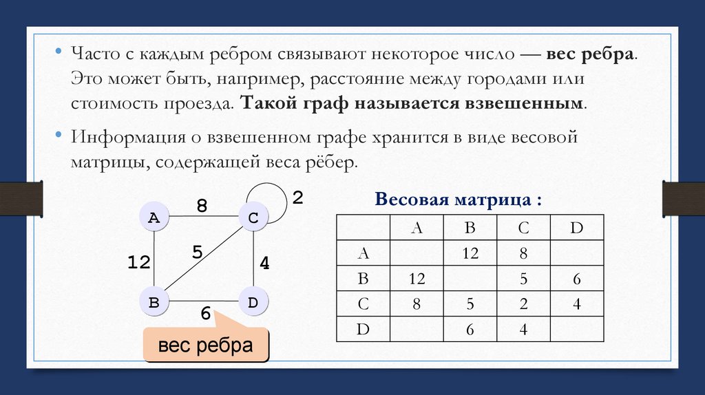 • Часто с каждым ребром связывают некоторое число — вес ребра.Это может быть, например, расстояние между городами или