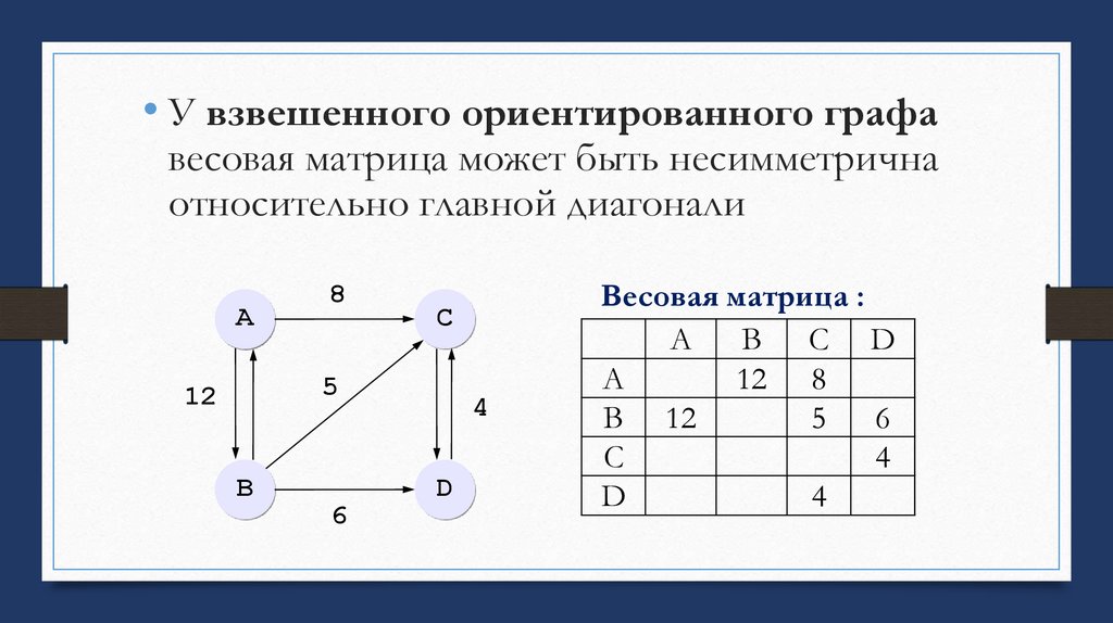 • У взвешенного ориентированного графавесовая матрица может быть несимметрична
