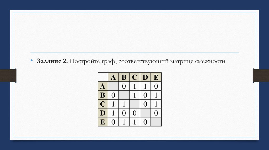 • Задание 2. Постройте граф, соответствующий матрице смежностиA B