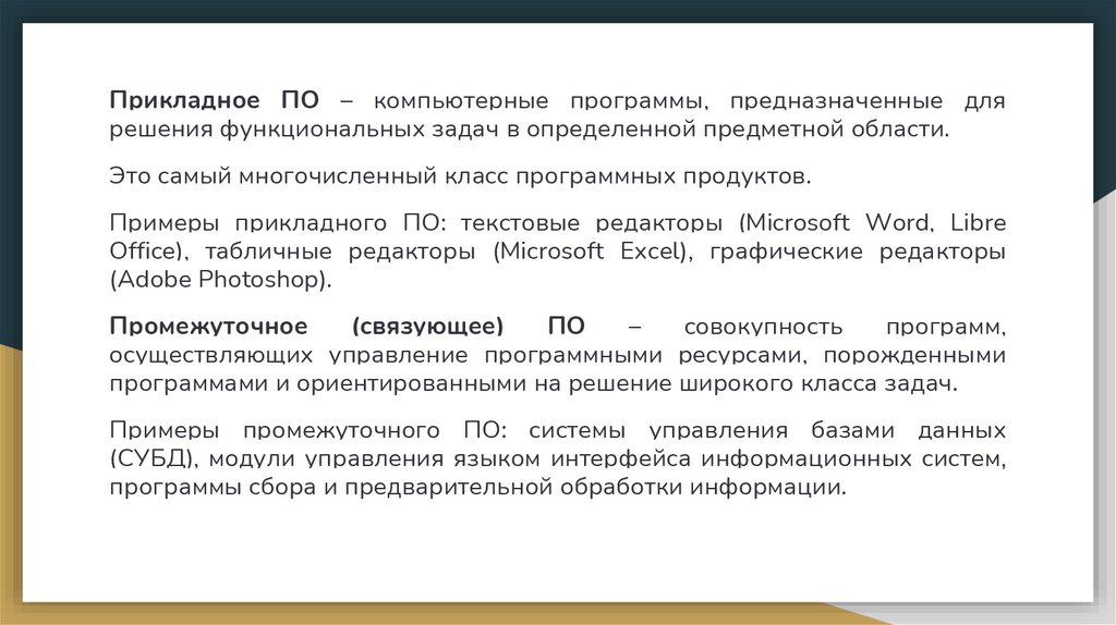 Прикладное ПО – компьютерные программы, предназначенные длярешения функциональных задач в определенной предметной области.