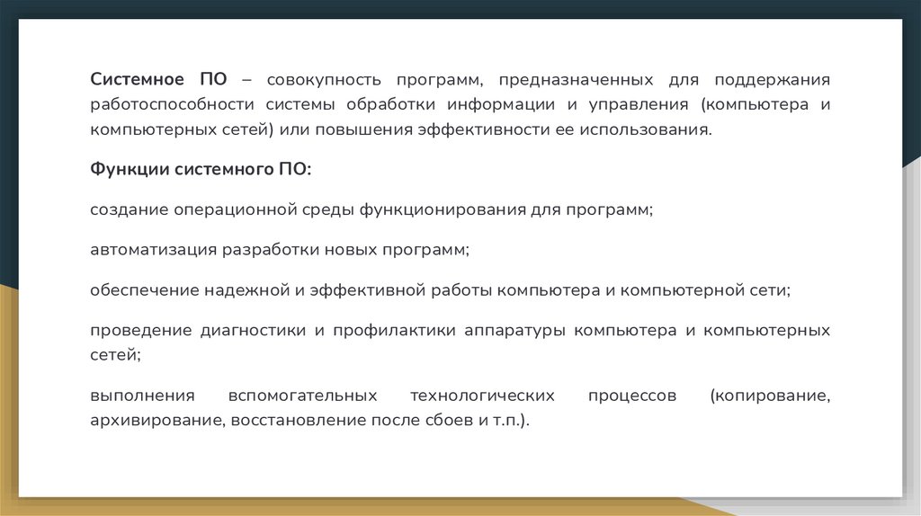 Системное ПО – совокупность программ, предназначенных для поддержанияработоспособности системы обработки информации и управления (компьютера и
