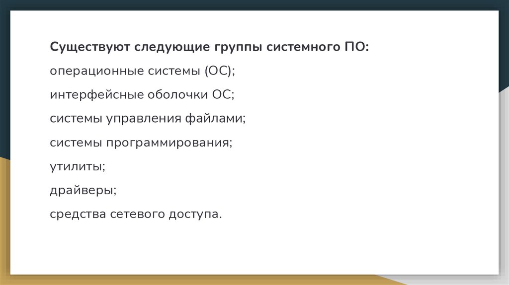 Существуют следующие группы системного ПО:операционные системы (ОС);