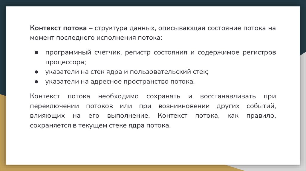 времени; появление более приоритетного готового потока; переход исполняющегося