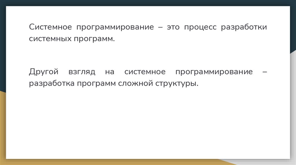 Системное программирование – это процесс разработкисистемных программ.