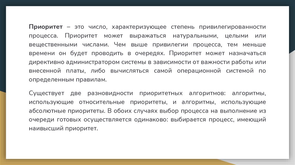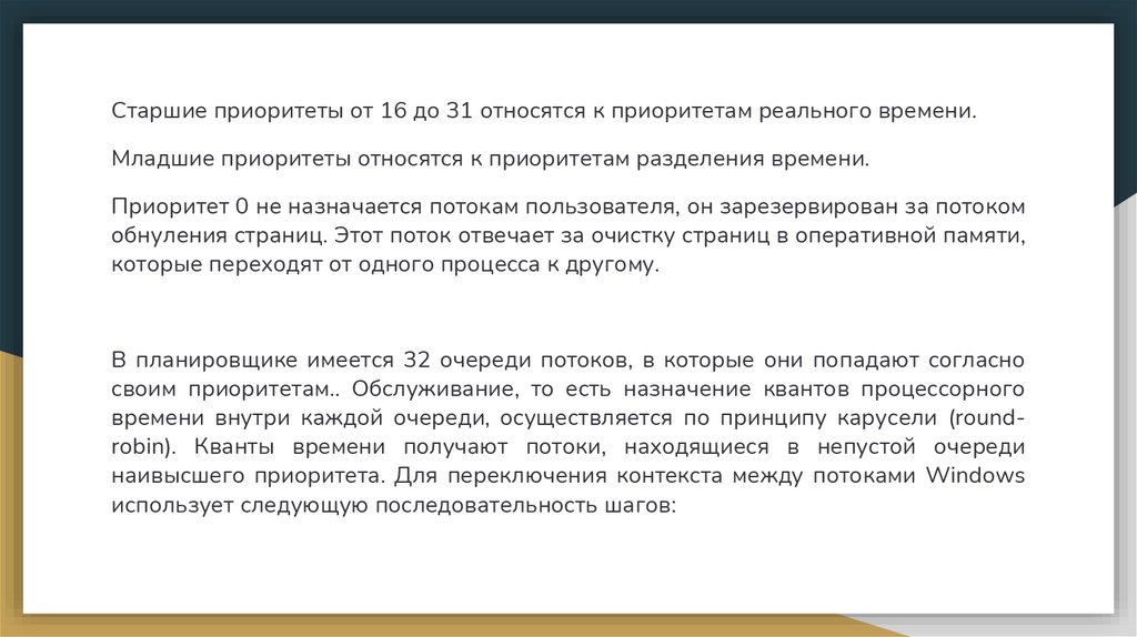 Старшие приоритеты от 16 до 31 относятся к приоритетам реального времени.Младшие приоритеты относятся к приоритетам разделения времени.