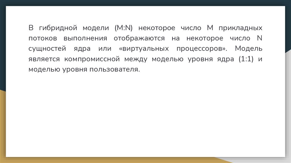 В гибридной модели (M:N) некоторое число M прикладныхпотоков выполнения отображаются на некоторое число N