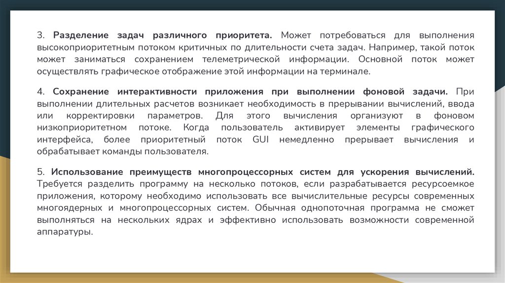3. Разделение задач различного приоритета. Может потребоваться для выполнениявысокоприоритетным потоком критичных по длительности счета задач. Например, такой поток