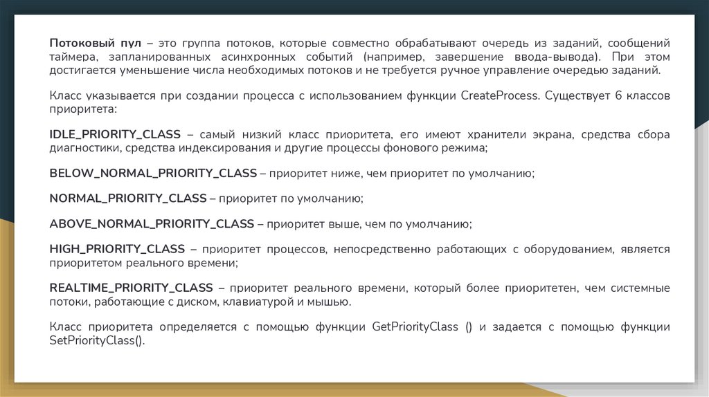 REALTIME_PRIORITY_CLASS – приоритет реального времени, который более приоритетен, чем системные