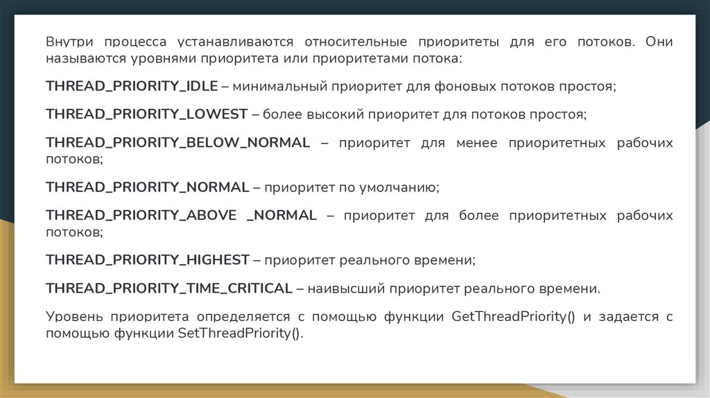 Внутри процесса устанавливаются относительные приоритеты для его потоков. Ониназываются уровнями приоритета или приоритетами потока: