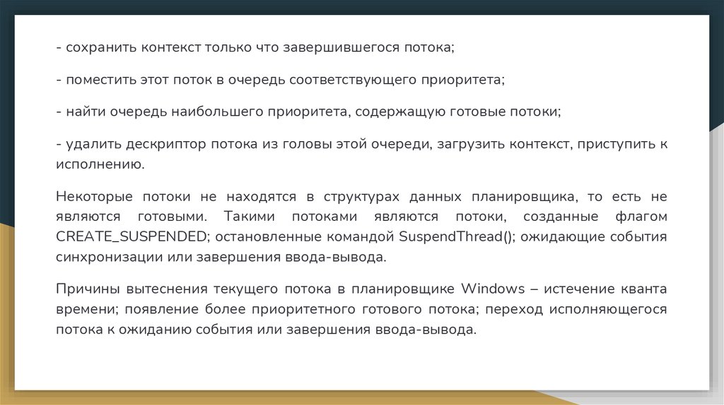 - сохранить контекст только что завершившегося потока;- поместить этот поток в очередь соответствующего приоритета;