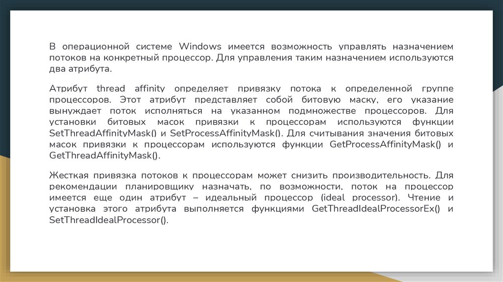 В операционной системе Windows имеется возможность управлять назначениемпотоков на конкретный процессор. Для управления таким назначением используются