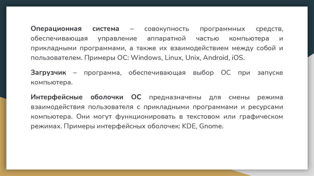 пользователем. Примеры ОС: Windows, Linux, Unix, Android, iOS.