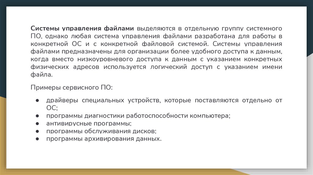 Системы управления файлами выделяются в отдельную группу системногоПО, однако любая система управления файлами разработана для работы в