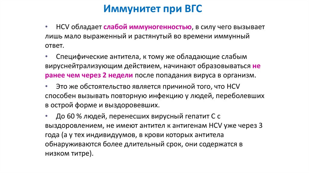 Иммунитет при ВГС• HCV обладает слабой иммуногенностью, в силу чего вызывает