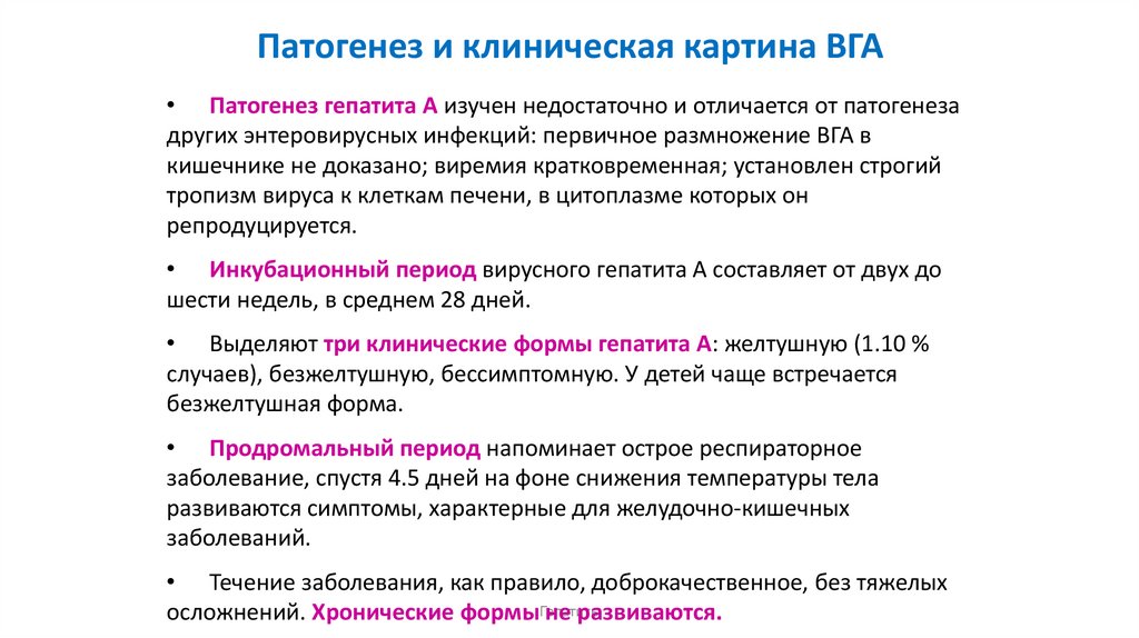 Патогенез и клиническая картина ВГА• Патогенез гепатита А изучен недостаточно и отличается от патогенеза
