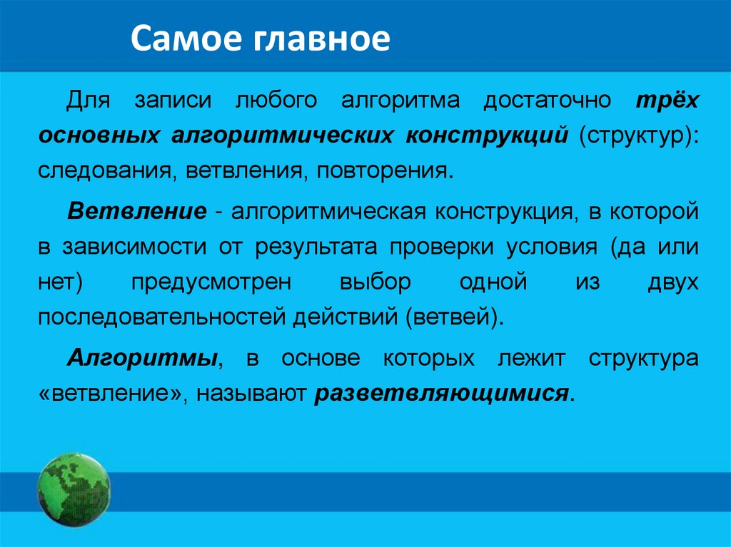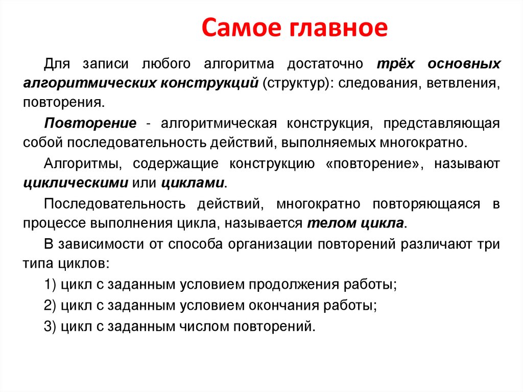Самое главноеДля записи любого алгоритма достаточно трёх