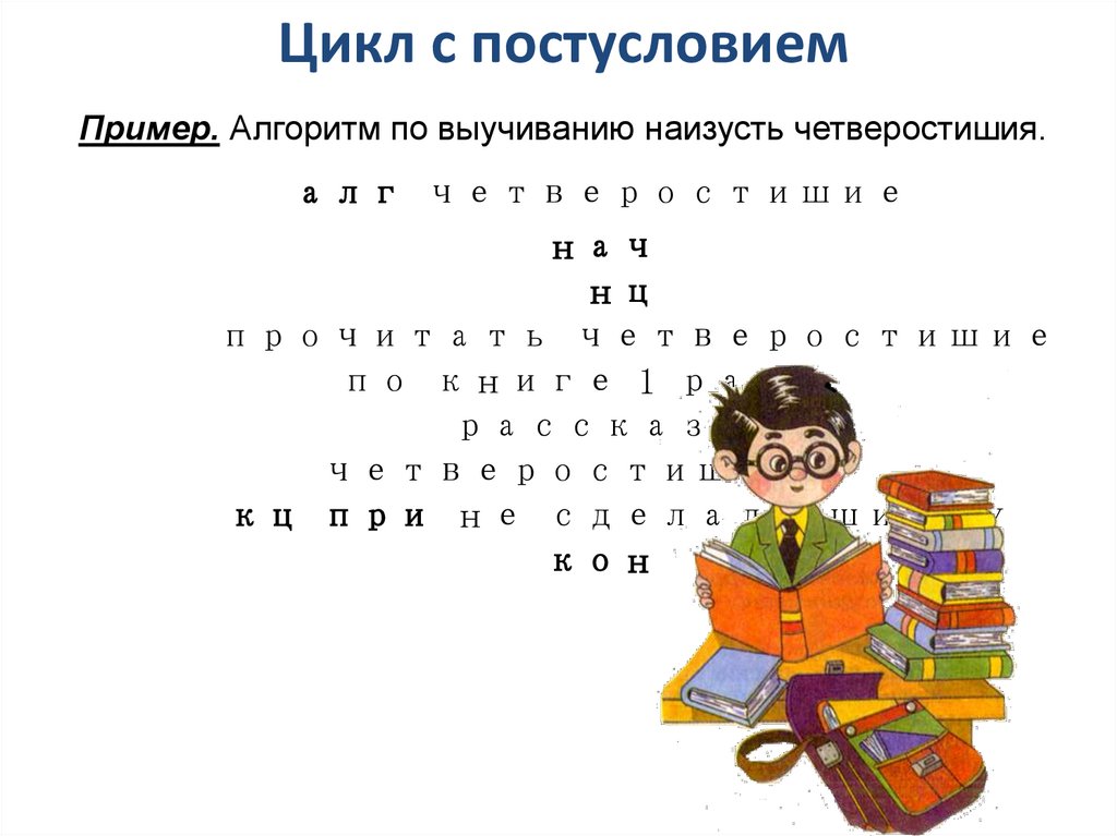 Цикл с постусловиемПример. Алгоритм по выучиванию наизусть четверостишия.