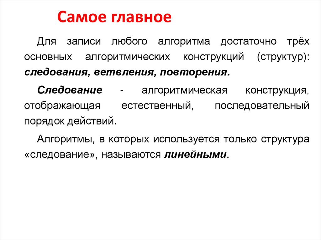 Самое главноеДля записи любого алгоритма достаточно трёх основных