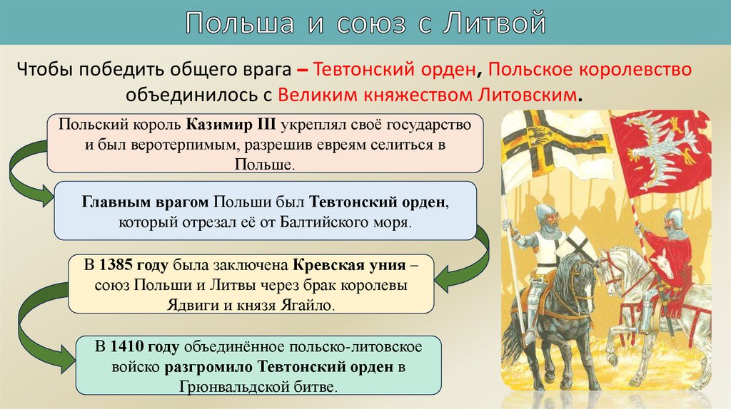 Чтобы победить общего врага – Тевтонский орден, Польское королевствообъединилось с Великим княжеством Литовским.