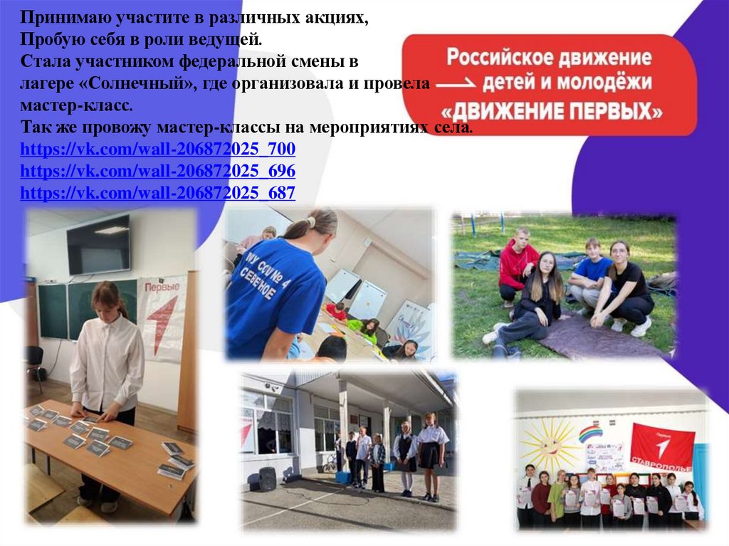 Принимаю участите в различных акциях,Пробую себя в роли ведущей.