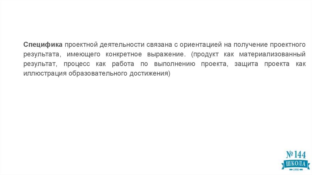 Специфика проектной деятельности связана с ориентацией на получение проектногорезультата, имеющего конкретное выражение. (продукт как материализованный
