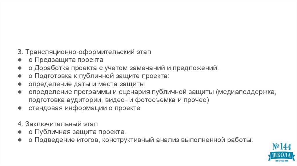 3. Трансляционно-оформительский этап● o Предзащита проекта