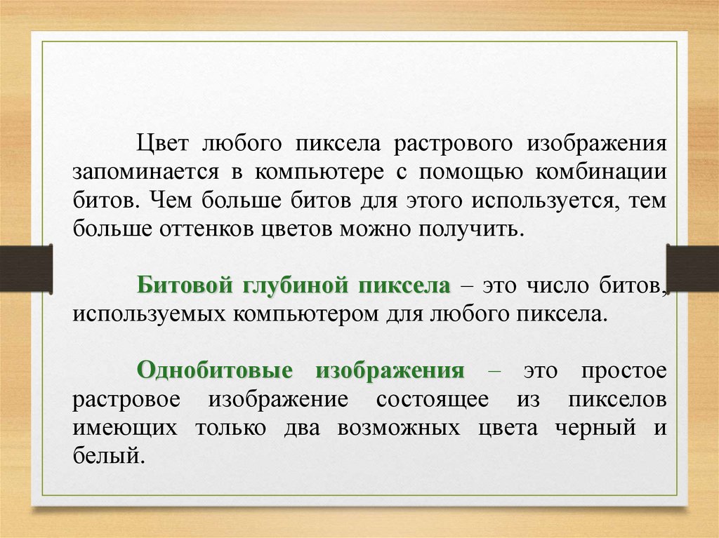 Битовой глубиной пиксела – это число битов,