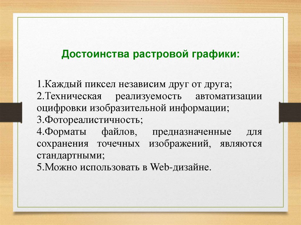 Достоинства растровой графики:1.Каждый пиксел независим друг от друга;