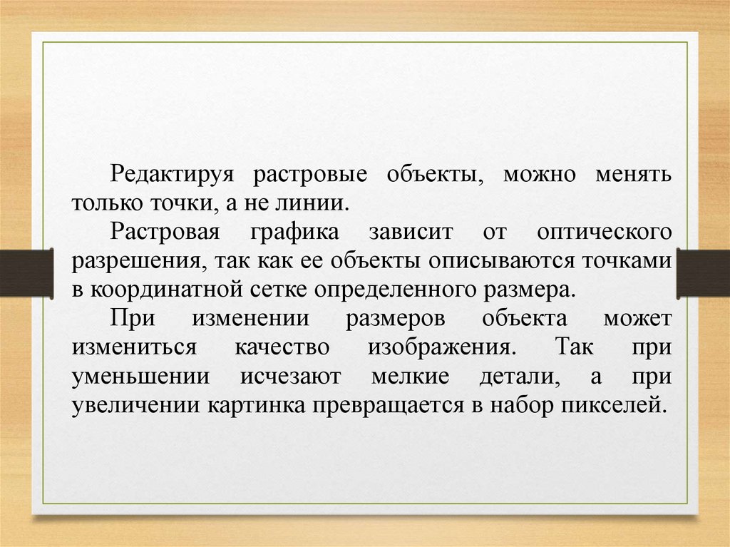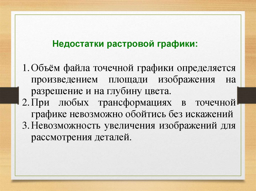 Недостатки растровой графики:1. Объём файла точечной графики определяется