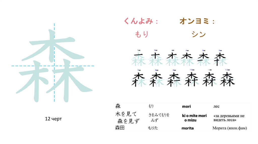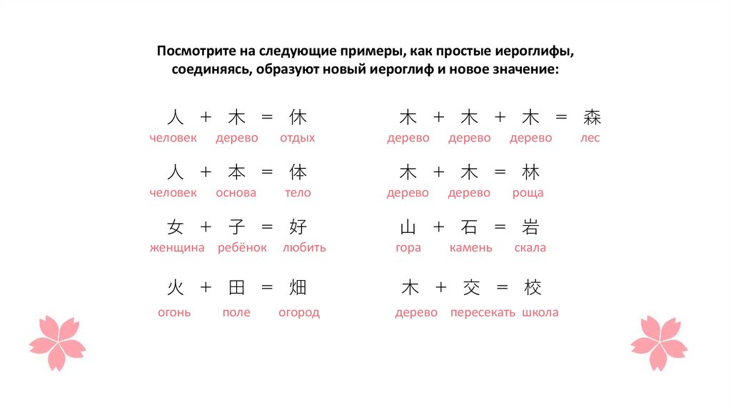 Посмотрите на следующие примеры, как простые иероглифы,соединяясь, образуют новый иероглиф и новое значение: