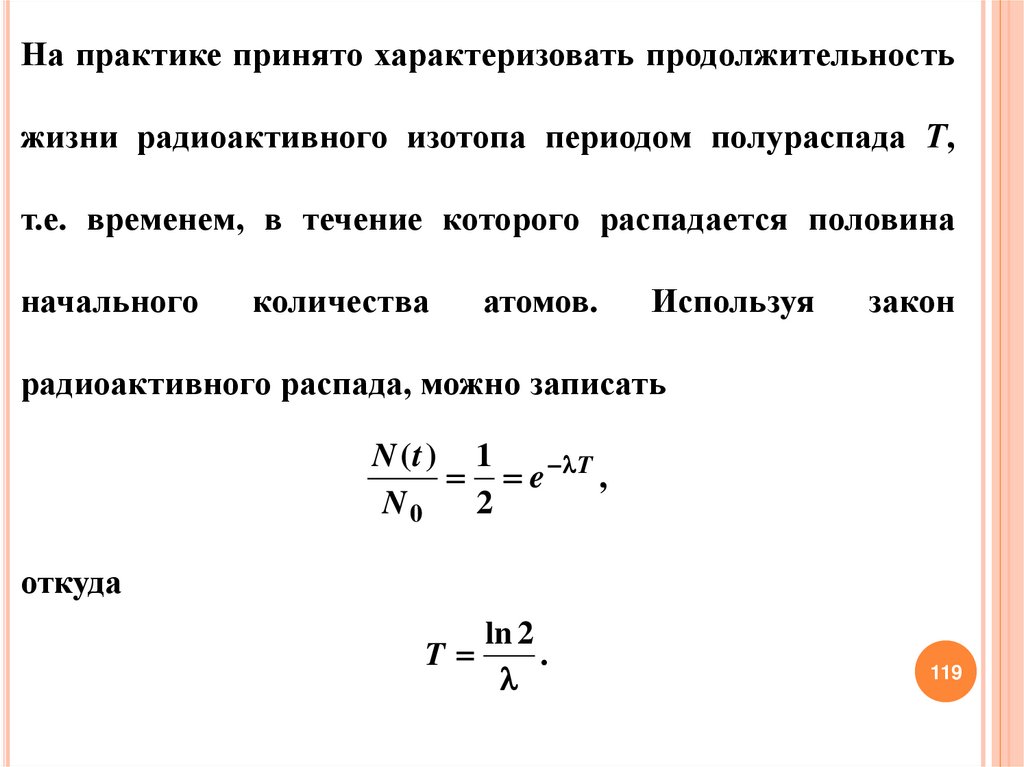 На практике принято характеризовать продолжительностьжизни радиоактивного изотопа периодом полураспада Т,