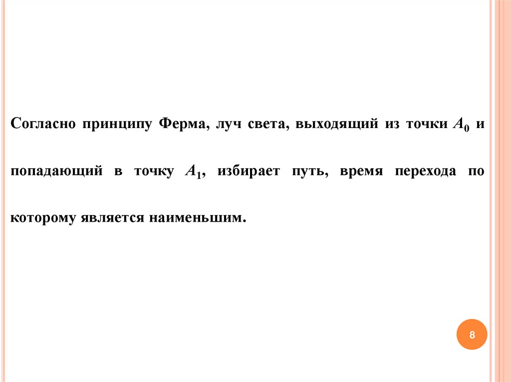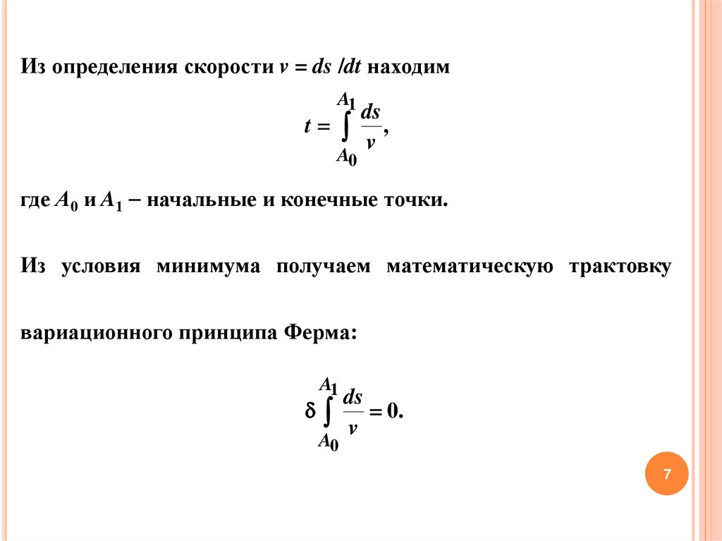 Согласно принципу Ферма, луч света, выходящий из точки А0 ипопадающий в точку А1, избирает путь, время перехода по