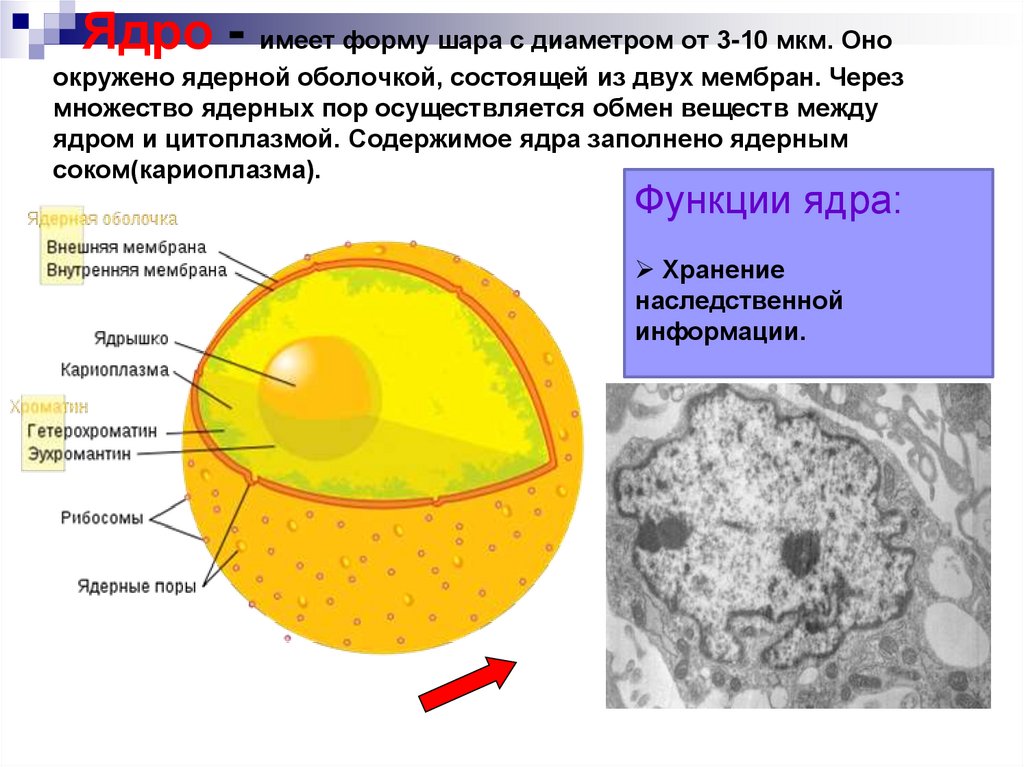 Ядро - имеет форму шара с диаметром от 3-10 мкм. Оноокружено ядерной оболочкой, состоящей из двух мембран. Через