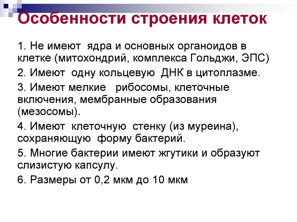 Особенности строения клеток1. Не имеют ядра и основных органоидов в