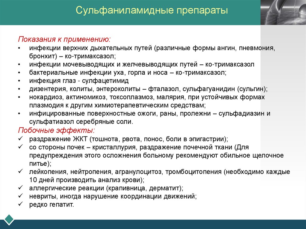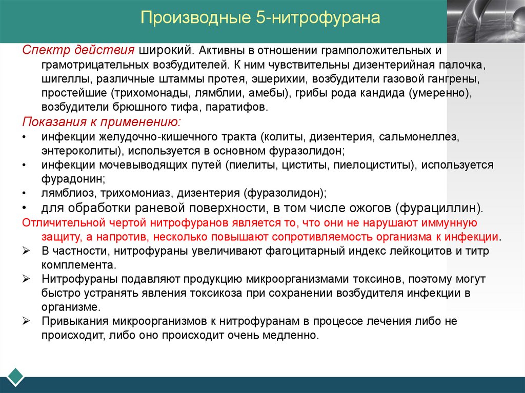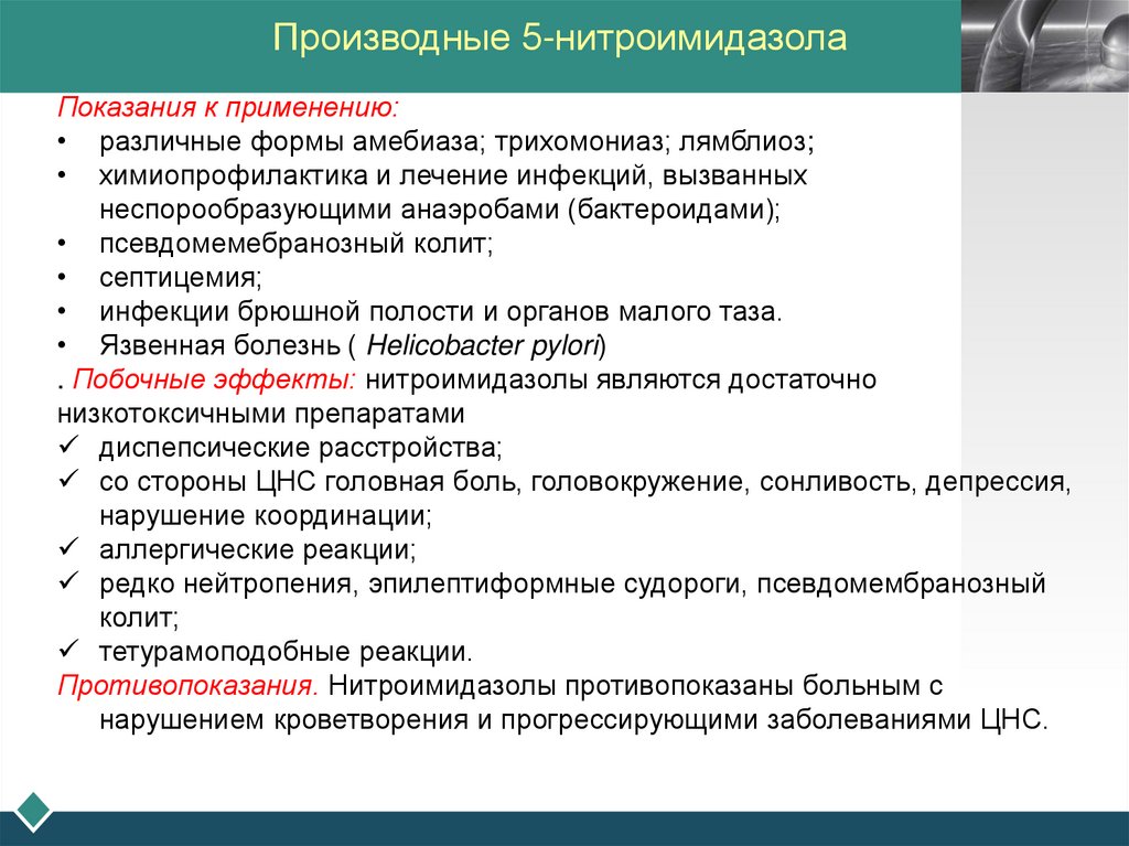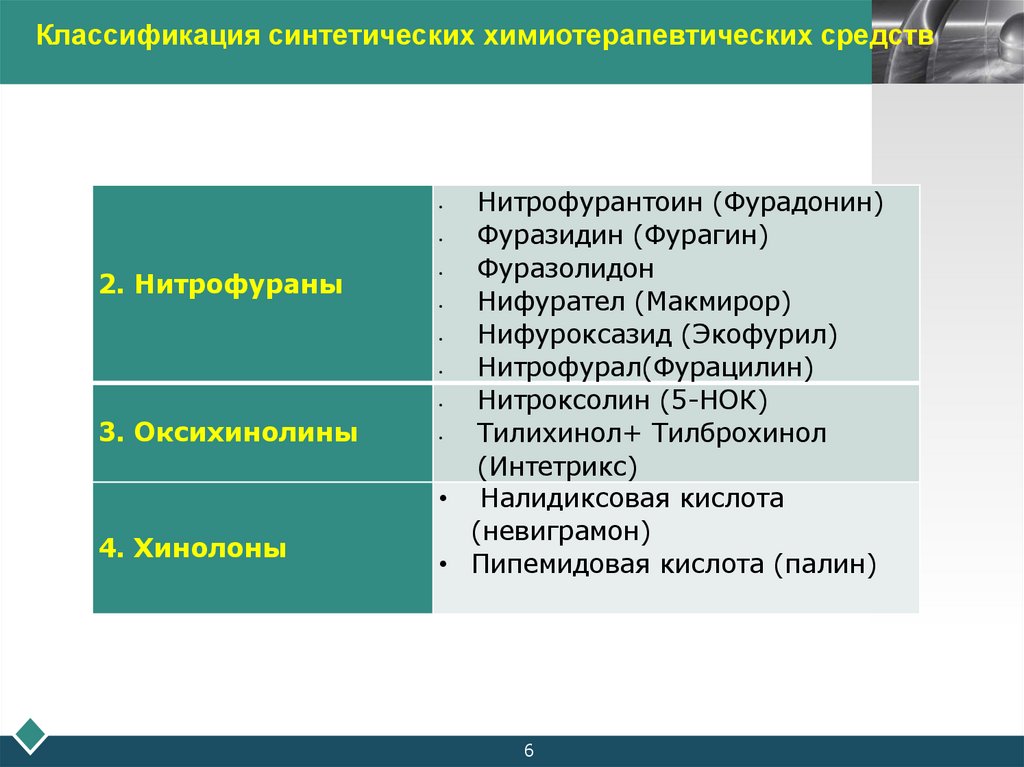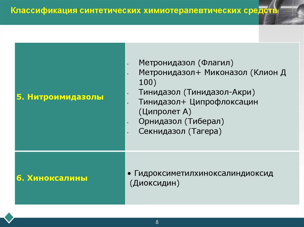 сульфаниламидные средства, производные нитрофурана, нитроимидазола, 8оксихинолины, хиноксалины.