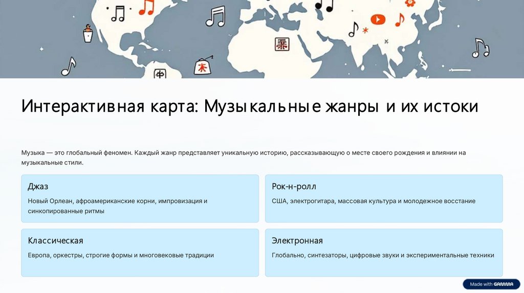 Интерактив ная карта: Музы кал ь ны е жанры и их истокиМузыка — это глобальный феномен. Каждый жанр представляет уникальную историю, рассказывающую о месте своего рождения и влиянии на