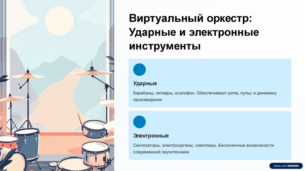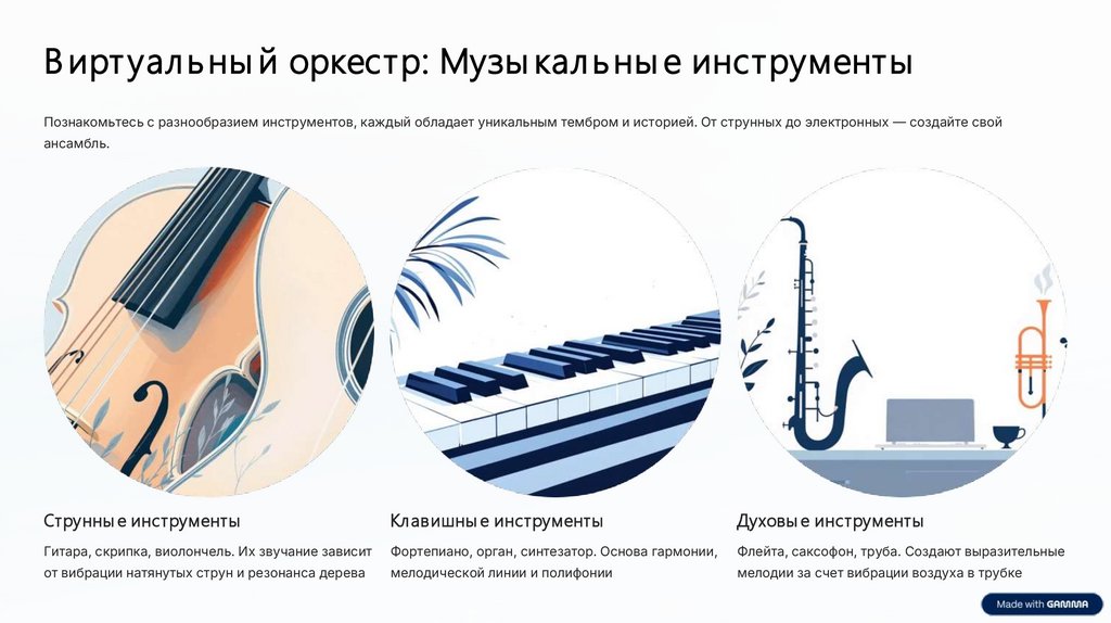 В ирт уал ь ны й оркестр: Музы кал ь ны е инструментыПознакомьтесь с разнообразием инструментов, каждый обладает уникальным тембром и историей. От струнных до электронных — создайте свой