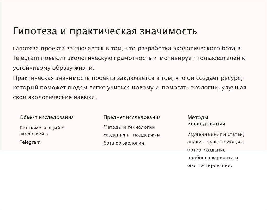 Гипотеза и практическая значимостьГипотеза проекта заключается в том, что разработка экологического бота в