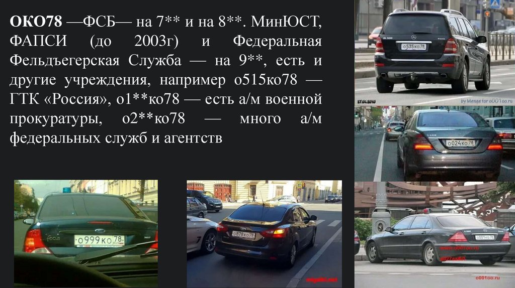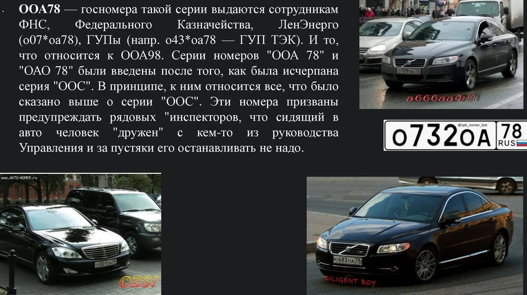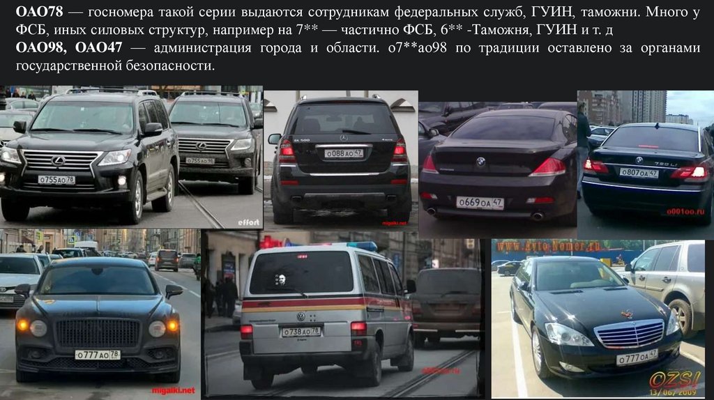 ОАО78 — госномера такой серии выдаются сотрудникам федеральных служб, ГУИН, таможни. Много уФСБ, иных силовых структур, например на 7** — частично ФСБ, 6** -Таможня, ГУИН и т. д