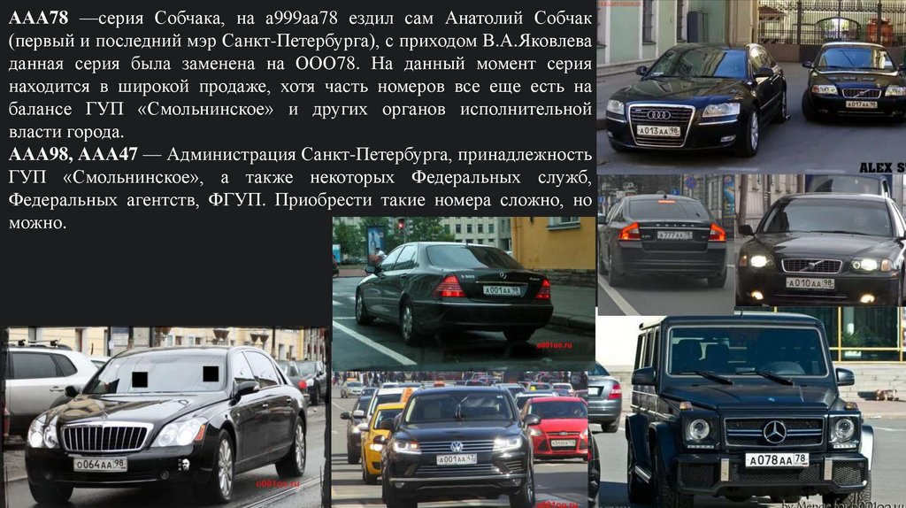 ААА78 —серия Собчака, на а999аа78 ездил сам Анатолий Собчак(первый и последний мэр Санкт-Петербурга), с приходом В.А.Яковлева