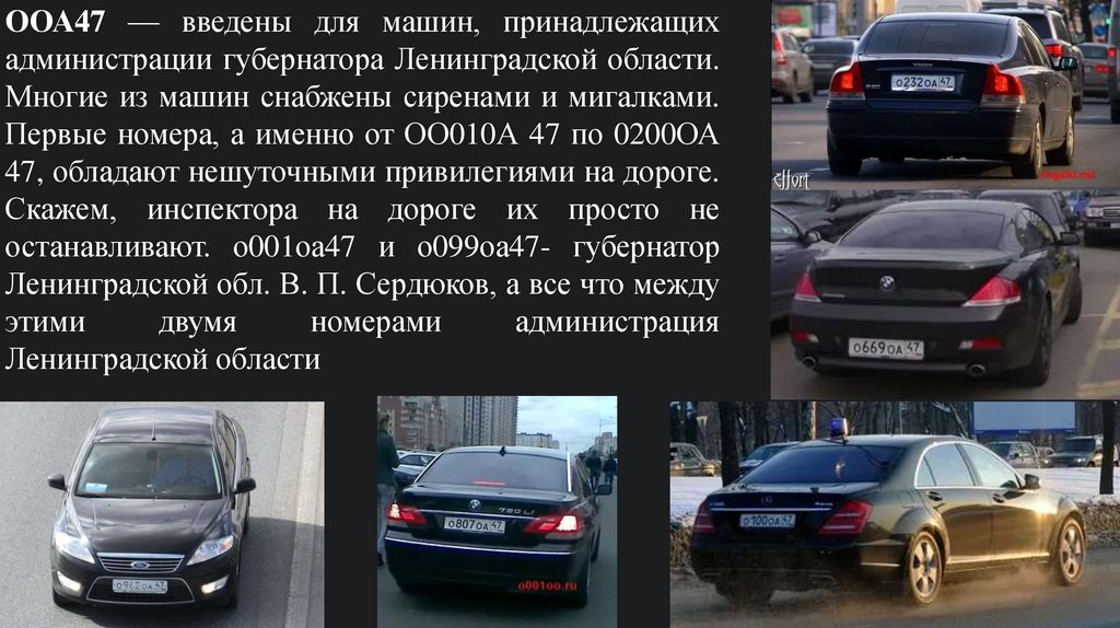 ООА47 — введены для машин, принадлежащихадминистрации губернатора Ленинградской области.