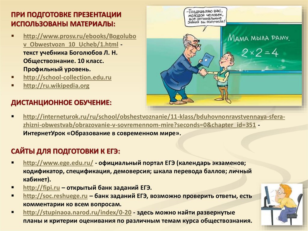 http://interneturok.ru/ru/school/obshestvoznanie/11-klass/bduhovnonravstvennaya-sferazhizni-obwestvab/obrazovanie-v-sovremennom-mire?seconds=0&chapter_id=351 ИнтернетУрок «Образование в современном мире».