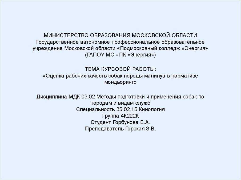 Дисциплина МДК 03.02 Методы подготовки и применения собак по