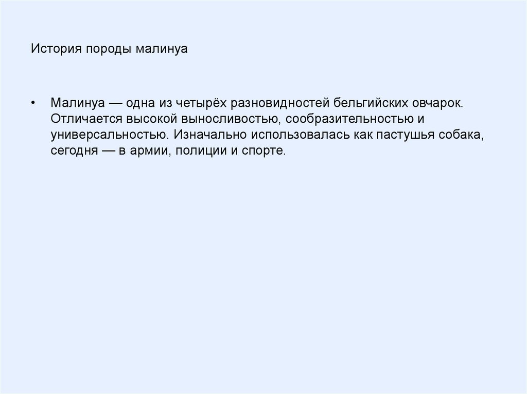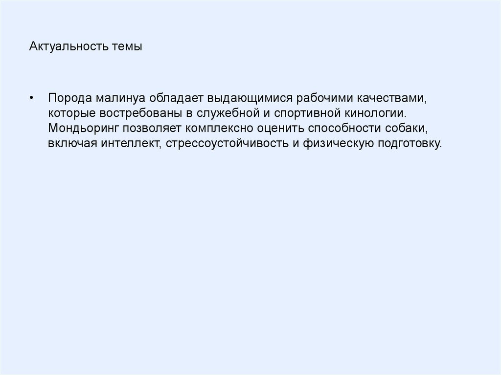 Актуальность темыПорода малинуа обладает выдающимися рабочими качествами,