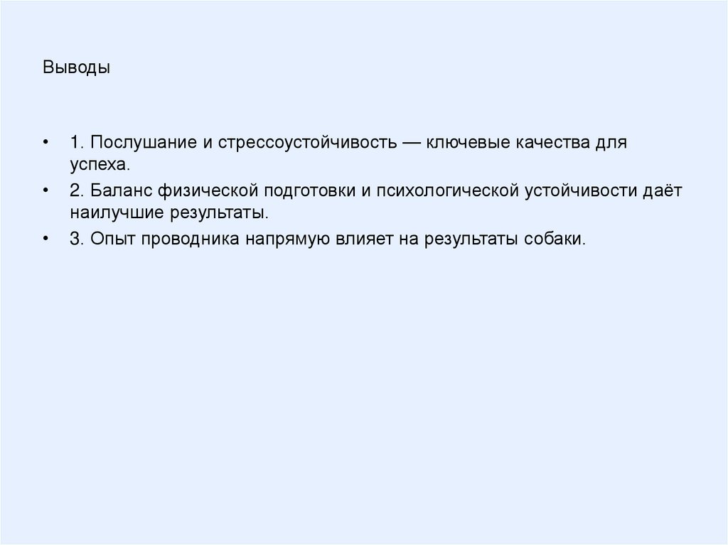 Выводы1. Послушание и стрессоустойчивость — ключевые качества для