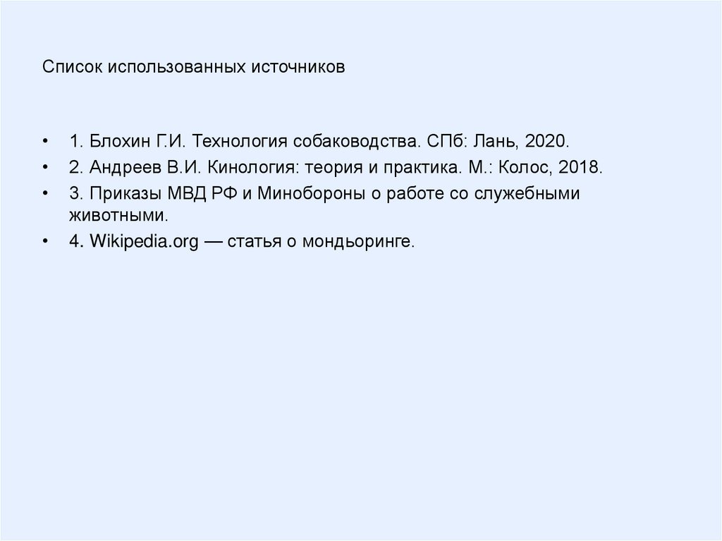 Список использованных источников1. Блохин Г.И. Технология собаководства. СПб: Лань, 2020.