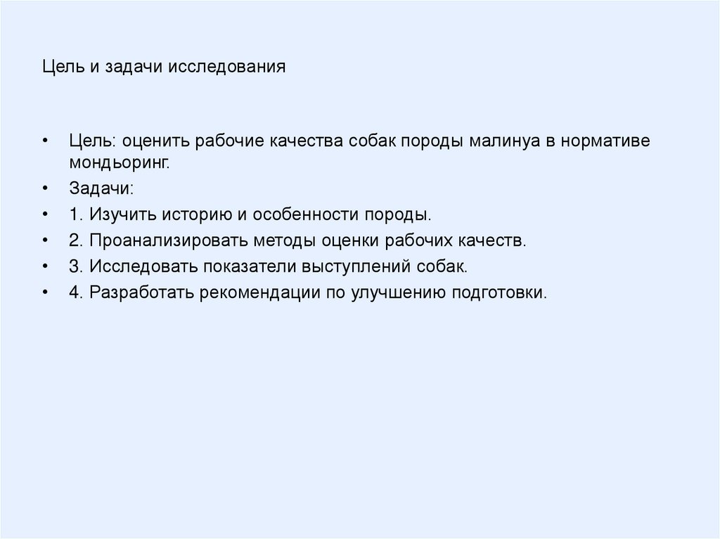 Цель и задачи исследованияЦель: оценить рабочие качества собак породы малинуа в нормативе