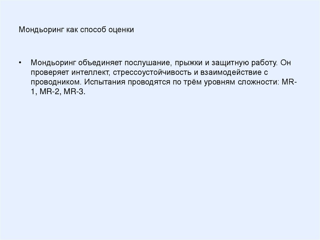 Мондьоринг как способ оценкиМондьоринг объединяет послушание, прыжки и защитную работу. Он