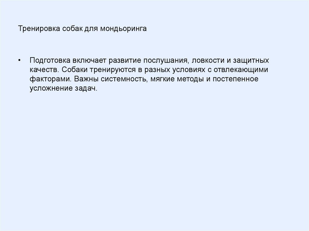 Тренировка собак для мондьорингаПодготовка включает развитие послушания, ловкости и защитных