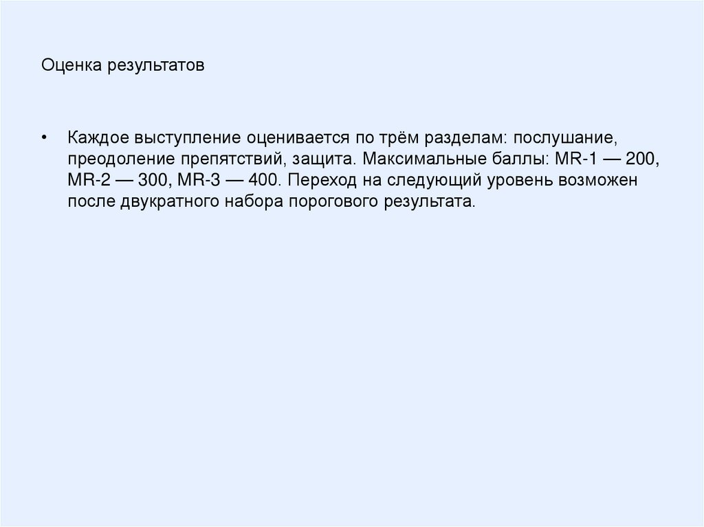 Оценка результатовКаждое выступление оценивается по трём разделам: послушание,
